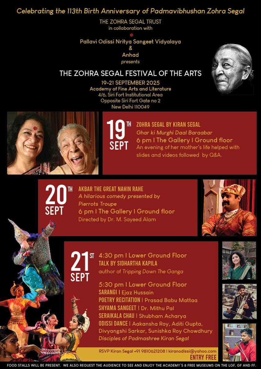 From 19th to 21st September 2025, the Academy of Fine Arts and Literature hosted the Zohra Segal Festival of the Arts, celebrating the 113th birth anniversary of Padmavibhushan Zohra Segal. Organized by The Zohra Segal Trust in collaboration with Pallavi Odissi Nritya Sangeet Vidyalaya and Anhad, the three-day festival brought together theatre, music, dance, talks, and personal tributes. Highlights included Zohra Segal by Kiran Segal—an intimate evening of memories with slides and videos, the comedy play Akbar the Great Nahin Rahe by Pierrot’s Troupe, as well as performances of sarangi, poetry, Odissi dance, and more. The festival not only honored Zohra Segal’s extraordinary artistic legacy but also reflected the Academy’s spirit of keeping art, dialogue, and cultural celebration alive.