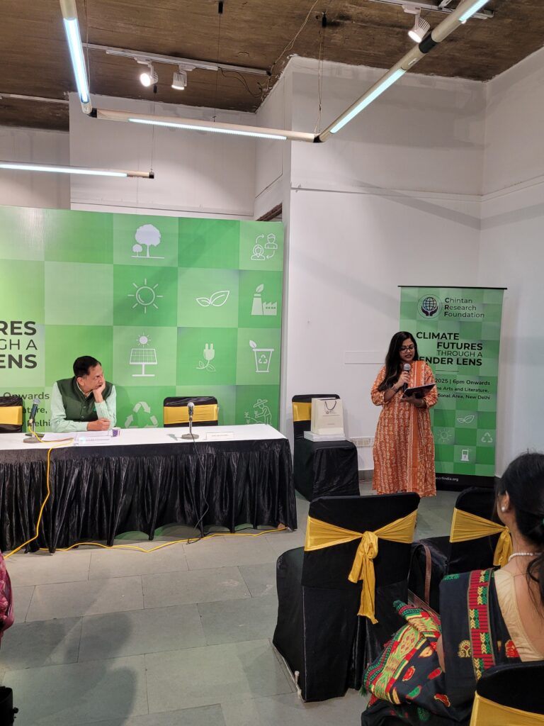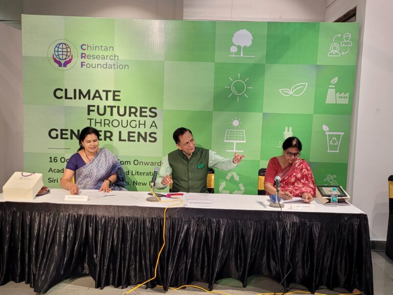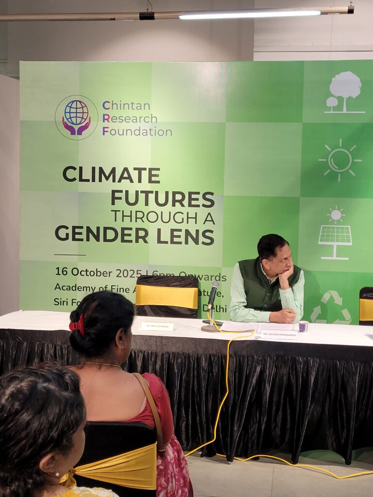 The discussion brought together two distinguished keynote speakers: Mrs. Kalyani Raj, President of the All India Women’s Conference, and Dr. Mini Govindan, Senior Fellow at TERI, both of whom presented critical insights on gender-responsive climate action, community resilience, and policy pathways. The session was moderated by Mr. Shishir Priyadarshi, President of the Chintan Research Foundation, who guided a thoughtful and engaging conversation.