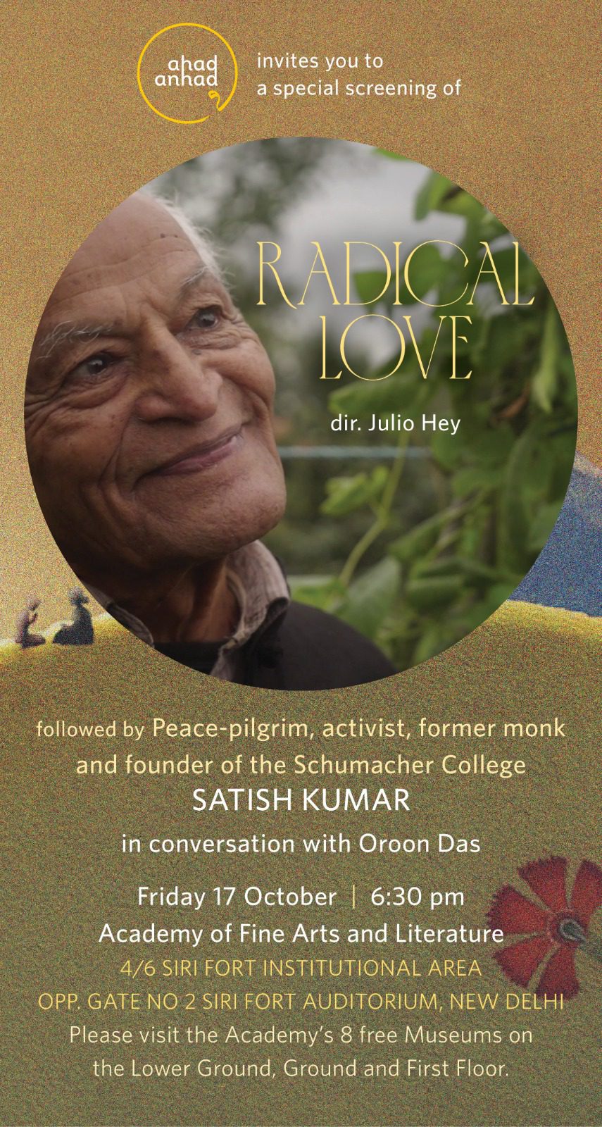 Following the screening, the audience engaged in an inspiring conversation with Satish Kumar, renowned peace-pilgrim, activist, former monk, and founder of Schumacher College. In dialogue with Oroon Das, Satish Kumar offered reflections on love as a radical act, ecological consciousness, and the role of inner harmony in shaping a more humane world.