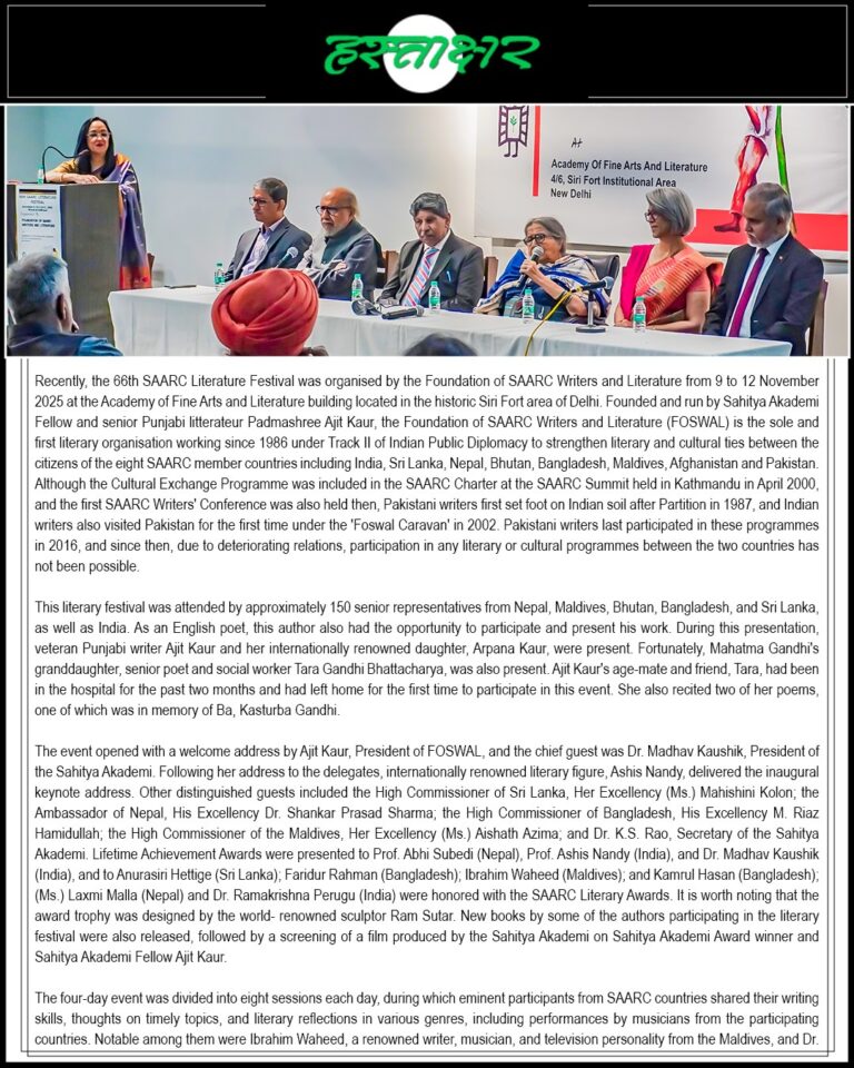 The celebration also honoured Cour’s lifelong contribution to literature and cultural connectivity. As founder of FOSWAL, she has spent decades strengthening artistic ties across South Asia, a legacy highlighted in the festival reports.